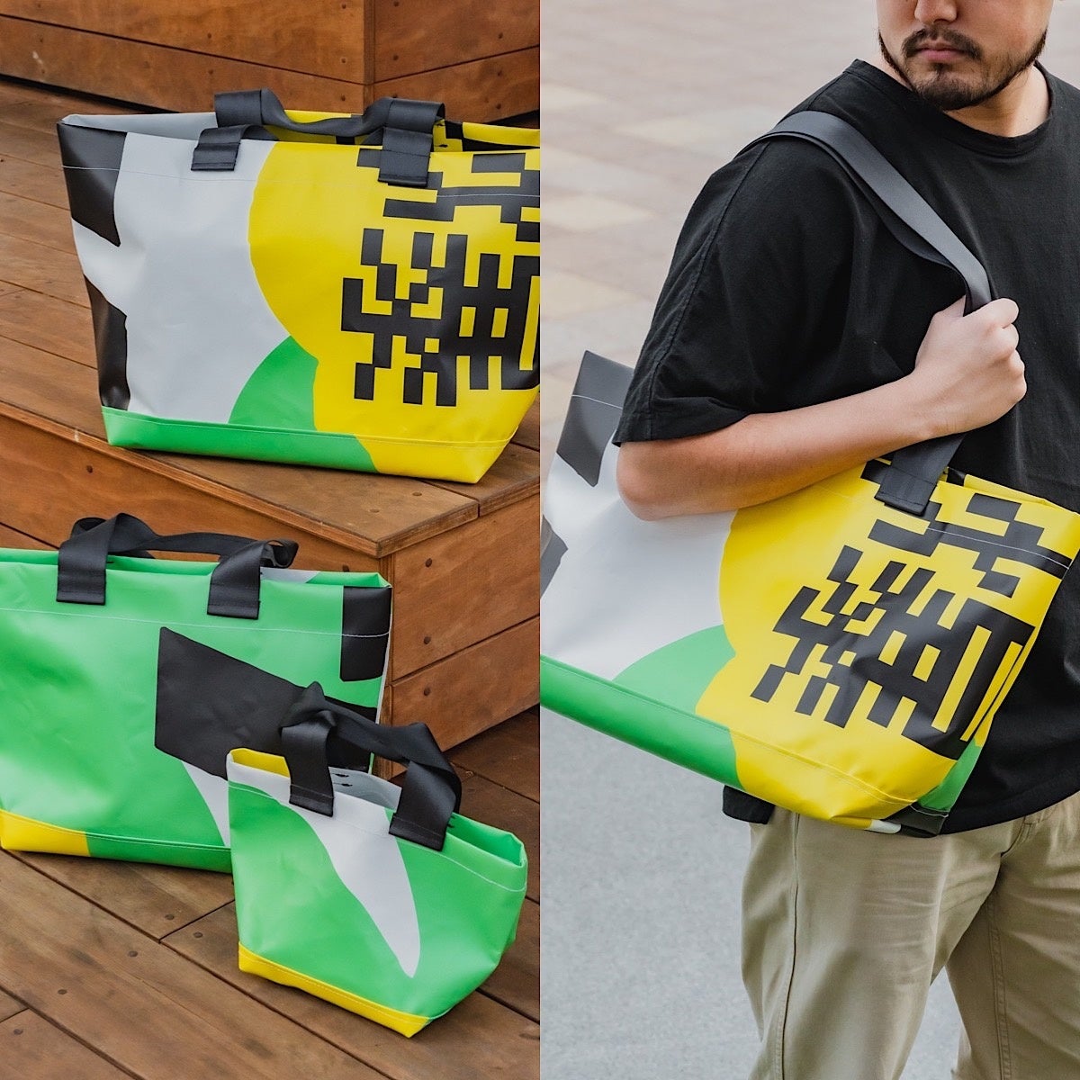 本来廃棄されてしまう、防水性のイベントタペストリーを再利用し作成したトートバッグ。