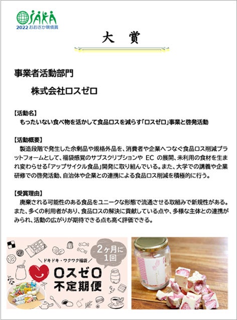 もったいない食品を活かし、エシカルな消費スタイルを創造する株式会社ロスゼロ(大阪市西区、代表 文美月)は令和4年度「おおさか環境賞」大賞を受賞したことをお知らせします。当社の食品ロス削減サブスクリプション「ロスゼロ不定期便」やアップサイクル商品開発事業など、ユニークな形で新しい商流を創り出す点で高い評価を受け、受賞に至りました。今回の大賞を受け、当社は資源循環社会の実現を目指し、さらに邁進してまいります。