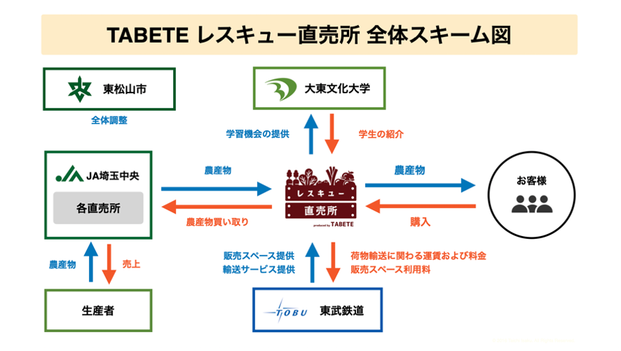 本取り組みは、東松山市周辺の5か所の農産物直売所で売れ残った農産物を株式会社コークッキングが買い取り、当日中に東武東上線 森林公園駅から列車で池袋駅まで輸送し「池袋駅 東武東上線南改札 券売機前」で大東文化大学の学生が運営に携わり、都心のお客様に再販売するものです。2021年3月と2021年6月の合計2回の実証実験を経て、2021年8月2日から本格運用を開始しました。