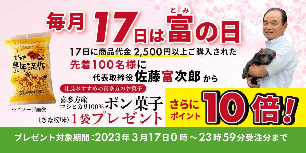 佐藤のラッキーナンバー「17」と佐藤の名前・富次郎から、弊社では17日を「富の日」と制定し、お客様に感謝の気持ちを込めて、毎月17日にプレゼントキャンペーンを開催します。