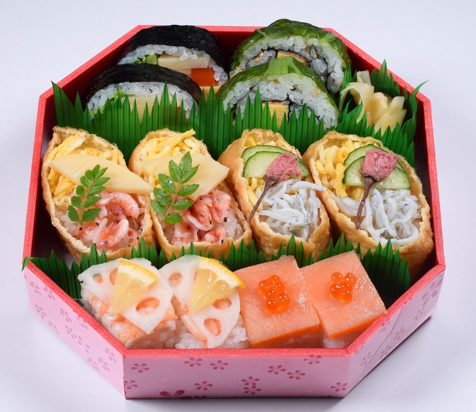 旬の釜揚げしらすや桜えびなどを彩り良く盛り付けたのっけいなり、海老やサーモンの押寿司、さらに2種の巻寿司を詰合せた、行楽の際にシェアしやすい一折。