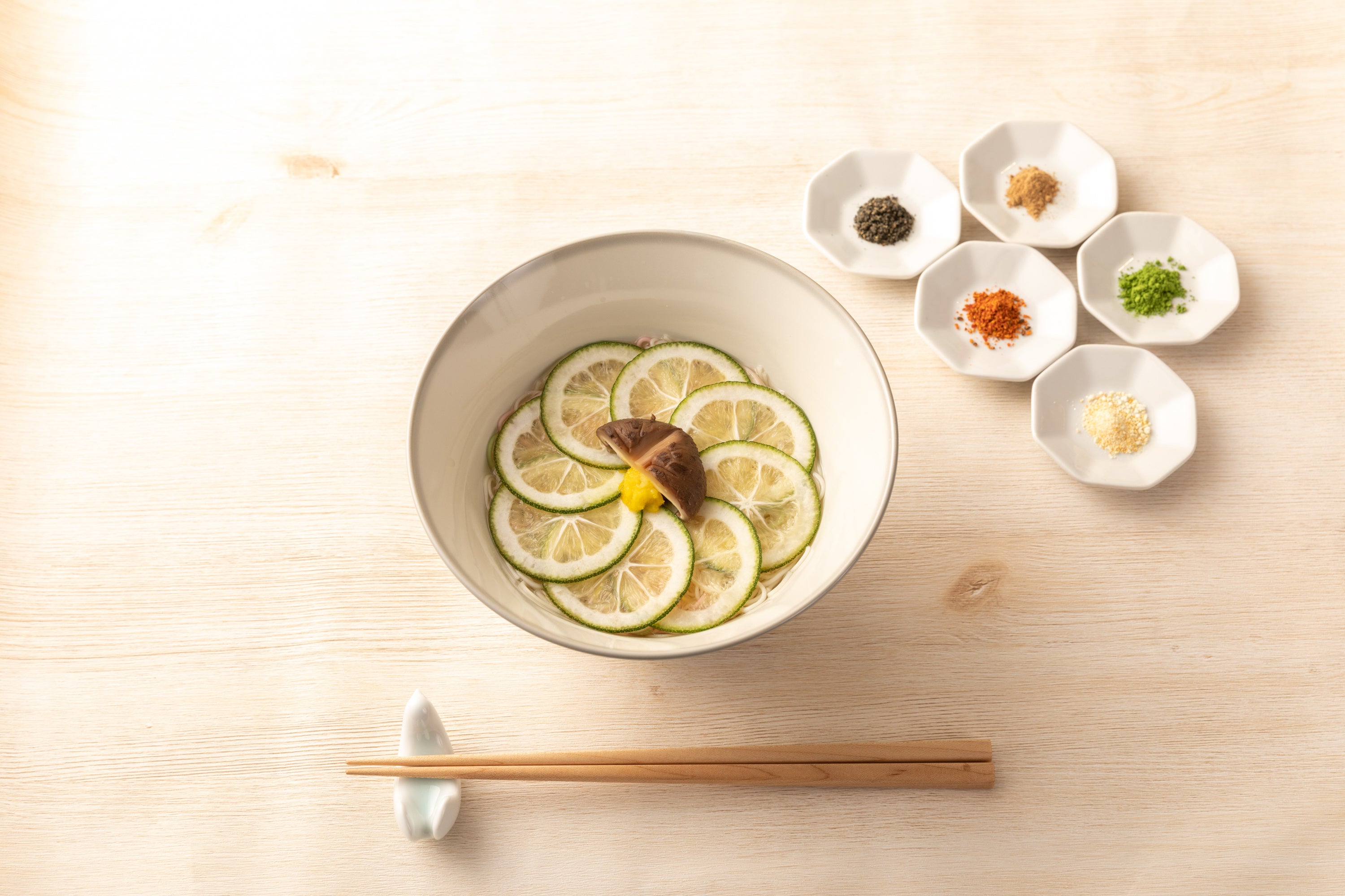 定番のおにぎりランチに加えて、新ランチメニューとして「京風すだちにゅうめん」が販売開始。すだちの酸味と上品な和風だし、喉越しの良いそうめんを、5種類の薬味(抹茶・黒胡麻・柚子・七味・生姜)と共にさっぱりとお楽しみください。オリジナルの出汁は、店内でじっくり一晩寝かせて取ったしいたけ出汁と京風だしを合わせて準備、コクのあるおいしさに仕上がっています。オプションとして+100円でとろろ昆布・梅干しのトッピングもお選びいただけます。お好みで温かいにゅうめんと冷たい素麺が楽しめる、これからの季節にさっぱりうれしいランチメニューです。