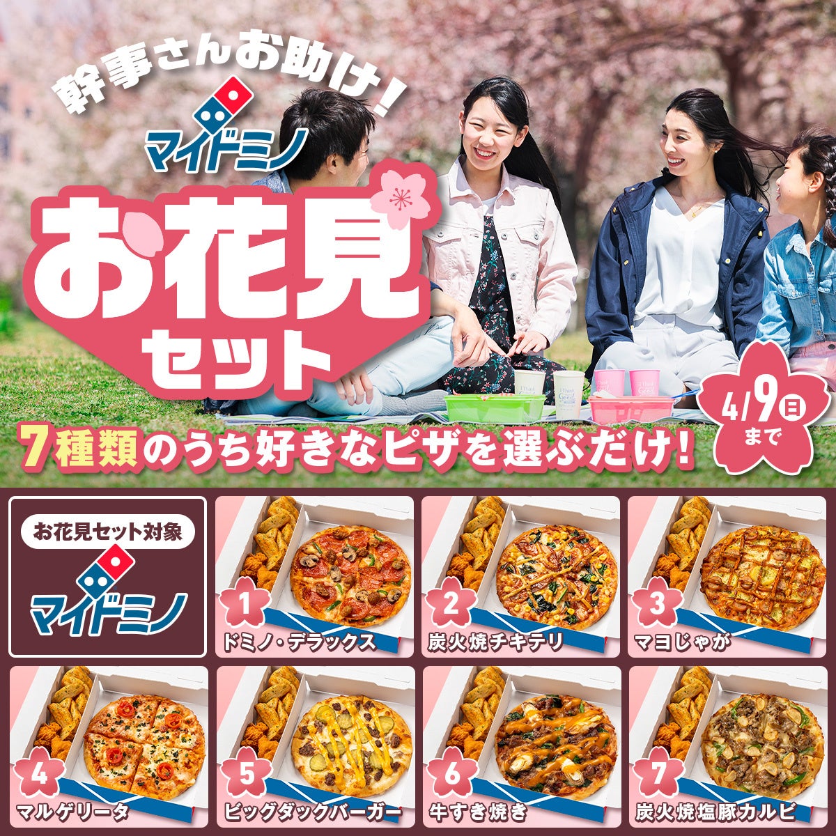 株式会社ドミノ・ピザ ジャパン(代表取締役:ジョシュア・キリムニック、CEO:マーティン・スティーンクス、本社:東京都品川区、以下:ドミノ・ピザ)が展開する国内No.1シェアを誇る宅配ピザチェーン ドミノ・ピザは、2023年3月20日(月)より『幹事さんお助け!「マイドミノ」お花見セット』を、4月9日までの期間限定で販売します。みんなが集まって桜を楽しむお花見はとても楽しいけれど、幹事さんはやることが盛りだくさんで準備が大変。そんな幹事さんの負担を減らすために、この『幹事さんお助け!「マイドミノ」お花見セット』では、ピザとサイドのベストの7つの組み合わせの「マイドミノ」をご用意しました。どれも、お花見にぴったりなピザとサイドメニュー2種類(ポテトフライ、ジューシーからあげ)がワンボックスになった参加者にもご満足いただける商品です。セットは固定されているので、幹事さんが参加者にどのサイドを組み合わせるのかいちいち尋ねる必要がありません。人気ある組み合わせ7種類から、どれがいいかを参加者に尋ねるだけでOK。