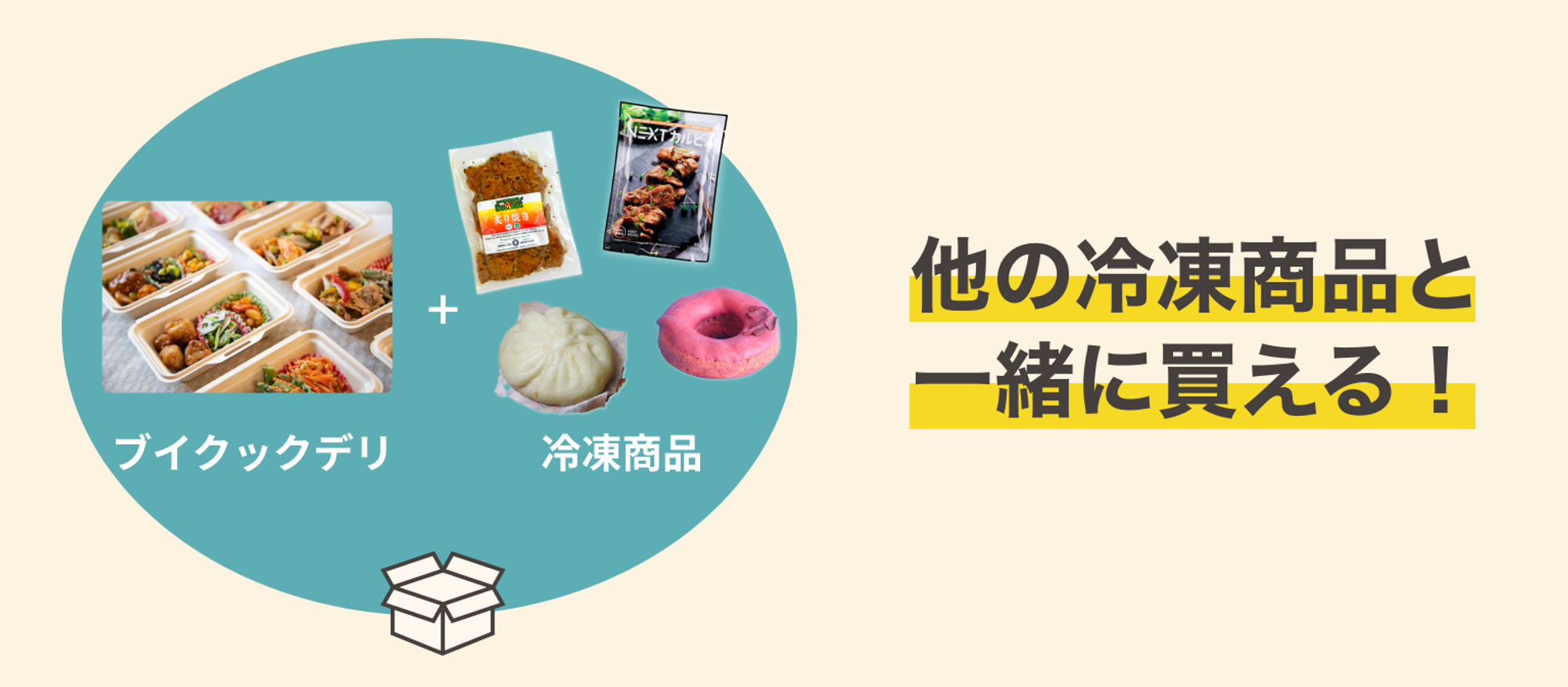 ブイクックデリの配送と同時に、代替肉や冷凍惣菜、スイーツなどのブイクックスーパーで取り扱う約100以上の冷凍商品を同梱配送で購入できます。