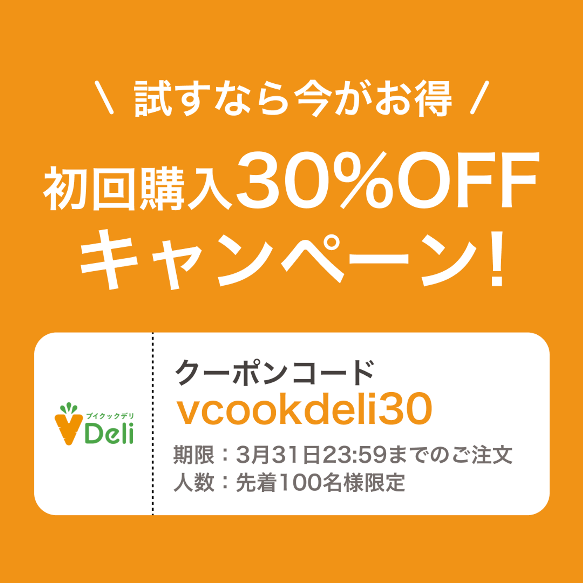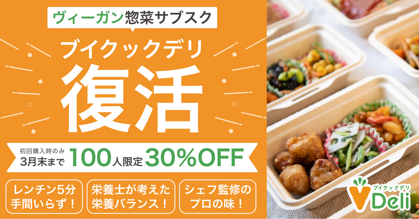 ブイクックデリの復活を記念して、3月末まで100名限定で【初回30%OFF】で提供いたします。