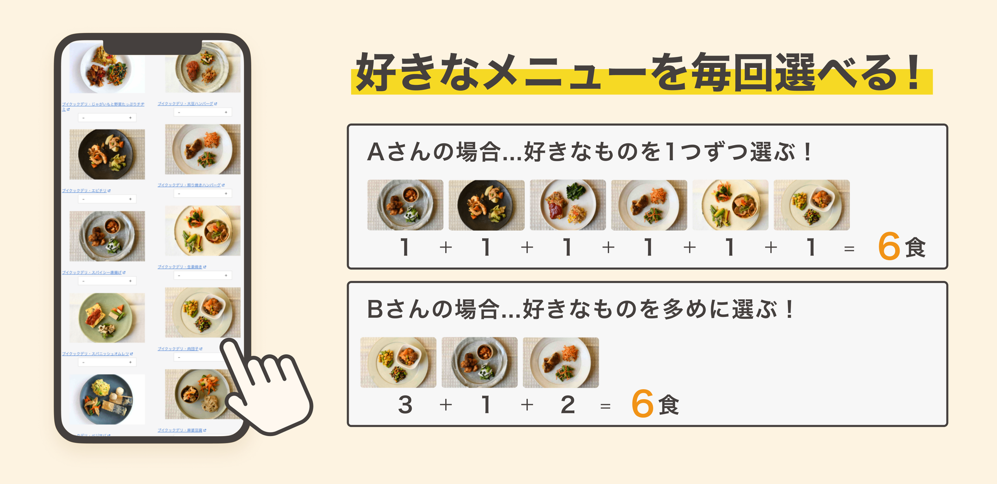 毎回の注文時に、サイト上で10メニューの中からお気に入りを自分で選んで、注文することができます。