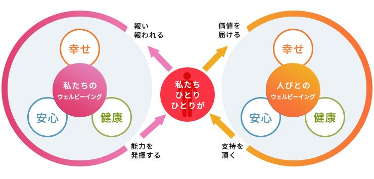 2023年はウェルビーイングへの取り組みを本格始動させます。ウェルビーイングを「将来にわたってよりよく生き続けること、すなわち健康で幸せな生活を送り続けること」と定義し、私たち自身のウェルビーイングを実現することが人びとのウェルビーイングにもつながると考え、“私たち”と“人びと”の2軸で構成しました。