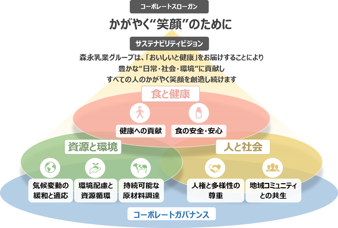 私たちは、あらゆるステークホルダーのかがやく“笑顔”のために、基盤となるコーポレートガバナンスをはじめ、「食と健康」「資源と環境」「人と社会」という3つのテーマを軸に活動を行い、サステナビリティビジョンの実現を目指します。