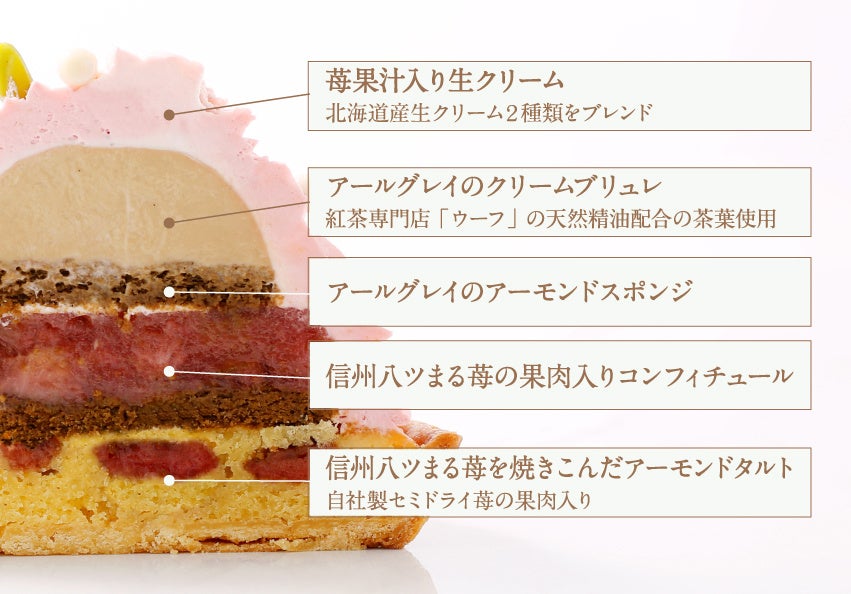 苺は、濃厚な甘みと香り高さを持つ八ヶ岳富士見高原の「八ツまる苺」を使用。じっくりと乾燥焼きして味わいを凝縮させたセミドライ苺の果肉を焼き込んだアーモンドタルトに、果肉感を残して炊き上げたみずみずしい苺のコンフィチュールを贅沢に重ねました。さらに紅茶専門店「ウーフ」の上品な香りのアールグレイを使用したなめらかなクリームブリュレとアーモンドスポンジを合わせたこだわ の一品です。