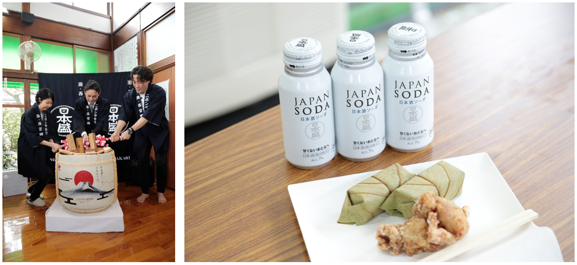 鏡開きではMCの声を合図に、当社執行役員 営業本部長の松本、田中みずきさん、ヨッピーさんの3名の手によりふたが割られ、会場は拍手に包まれました。試飲会では、「日本盛 JAPAN SODA」に合う日本盛おすすめの料理として、柿の葉寿司と鶏のから揚げのセットをご用意。甘さを控えたすっきりした後味の日本酒ソーダなので、日本酒に合う柿の葉寿司はもちろん、鶏のから揚げのようなこってりした味の料理まで、幅広い食事に合わせやすいお酒としてお楽しみいただけます。