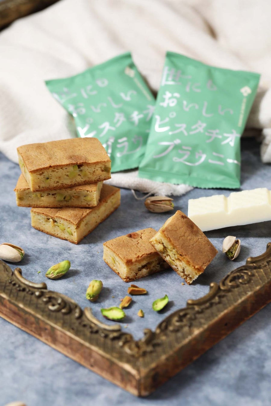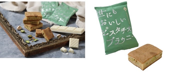 「世にもおいしいピスタチオブラウニー」は、ホワイトチョコレートを使用したピスタチオ風味の濃厚生地に、食感が楽しめるホワイトチョコとピスタチオをサンドして焼き上げた香ばしい風味のブラウニーです。