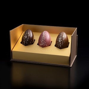 「ウォーヴァ・ディ・パスクワ」はイタリア語で “イースター・エッグ”を意味し、卵は新しい生命の息吹、豊穣のシンボルとして人々に知られ、春の祝祭 “イースター”に楽しまれます。ブルガリ イル・チョコラートがご用意する今年のイースター・エッグは、遊び心に溢れたピンク色のルビーチョコレートが仲間入りし、ルビーカカオ、ピスタチオ、ヘーゼルナッツの新しいフレーバー3種をひと箱に収めお届けいたします。酸味のあるフルーティーなルビーカカオとラズベリークリスピー、ビターチョコレートとピスタチオ、ミルクチョコレートとヘーゼルナッツの素材のマッチングが奏でるハーモニーがより深い味わいを生み出します。卵の殻を思いきり割ると、色鮮やかなラズベリー、ピスタチオ、ヘーゼルナッツとオレンジ、そしてゴールドリーフと「BVLGARI」のロゴが、繊細さと気品を放つジュエリーのように現れます。