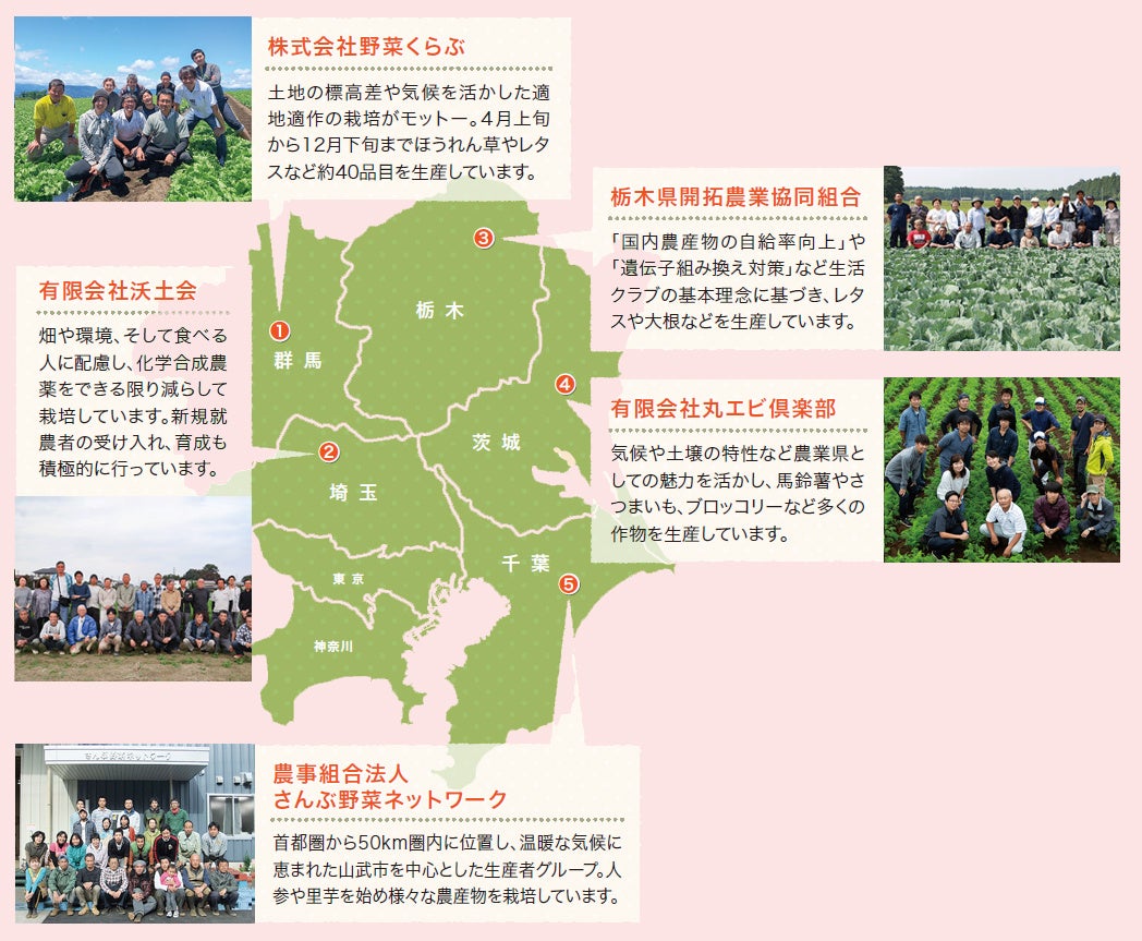 関東甲信越の5つの提携産地である、(株)野菜くらぶ〈群馬県〉、(有)沃土会〈埼玉県〉、