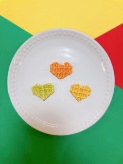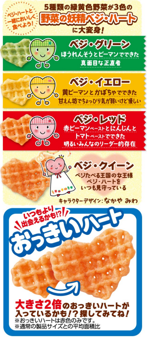 中身の3色のスナックは、かわいらしいハート型で、緑黄色野菜をおいしく楽しく食べられます。スナックの中には、大きさ約2倍の「おっきいハート」(赤色のみ)がまれに入っており、親子で探す楽しさや見つけたときにハッピー!な気持ちになれるなどとご好評をいただいています。今回発売20周年を記念して「おっきいハート」の出現率をアップ(2023年秋頃終了予定)。いつも以上のワクワク感を楽しんでいただけます。