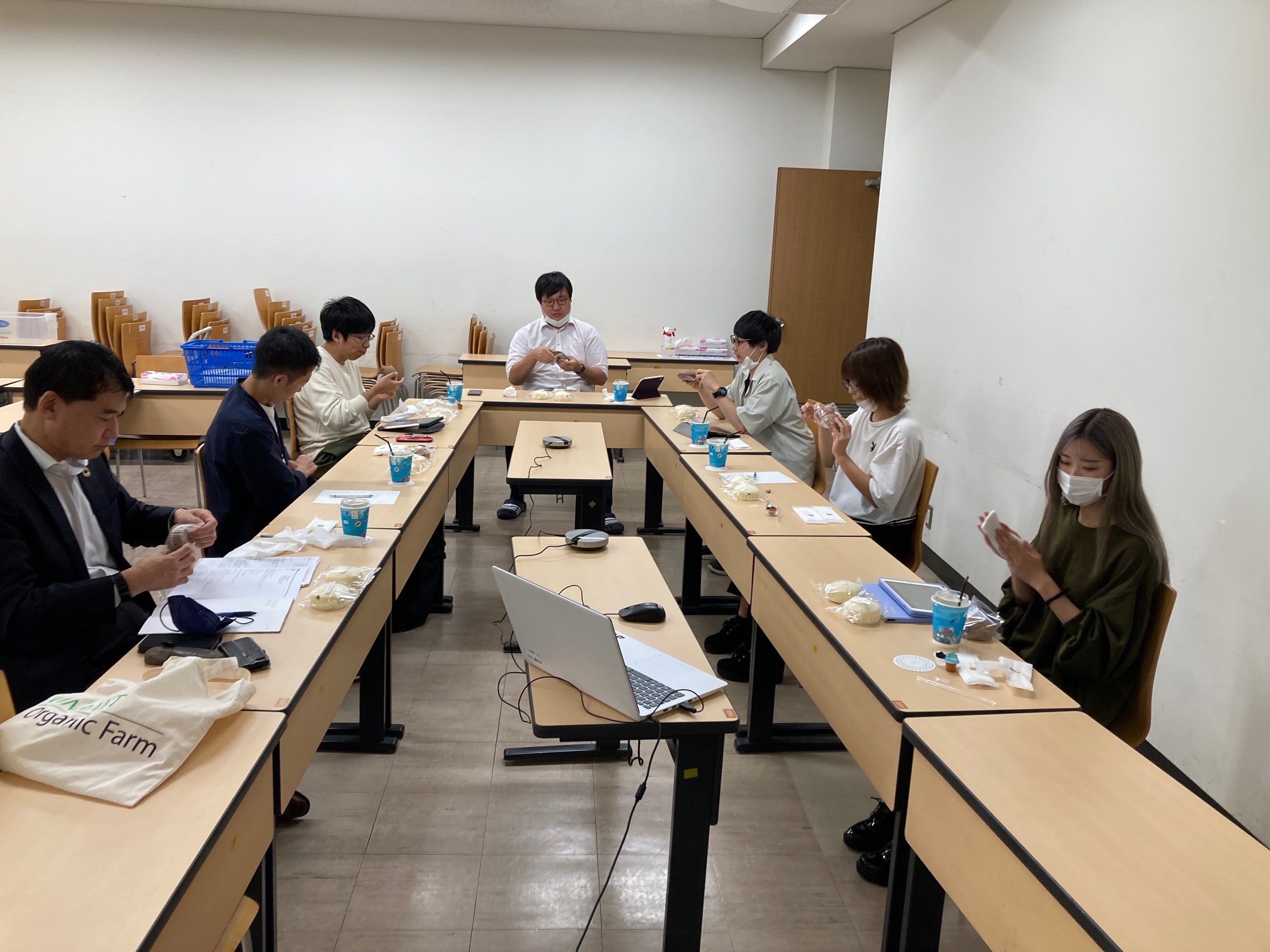 学生とフジパンの商品開発担当メンバーで意見を出し合い商品開発を進めました。開発のポイントとなったのは、『糀』単体の商品では味のイメージがつきづらく、購入意向に繋がらないのではないかという点でした。パンにして焼成してしまうと生地の香ばしい香りが『糀』の繊細な風味が活かされない為、『蒸しパン』に着目。『糀』の香りを活かした蒸しパンに学生のアイデアから同じ発酵食品である『チョコレート』を採用。どの世代からも人気のある『チョコレート』を使った『糀』と『チョコレート』を組み合わせた蒸しパンが約8ヶ月間の開発期間を経て出来上がりました。