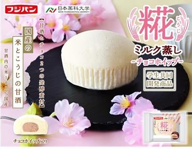 フジパン株式会社(名古屋市)は、日本薬科大学(埼玉県北足立郡伊奈町・東京都文京区)と連携し、発酵食品として注目が高まる『糀甘酒』を使用した商品を学生と共同開発し期間限定で販売いたします。日本薬科大学は健康や医療に関するリソースを活かし、『糀』の研究にも力を入れていることから今回の企画がスタートしました。学生ならではの柔軟な発想とアイデアで、これまでにない糀を使用した蒸しパンが生まれました。また発売に際して、3月25日に埼玉県の知事公館で実施される県庁内の福祉の店「かっぽ」主催のイベント「かっぽフェスタ」に100個を寄付いたします。