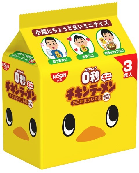 今回発売する「0秒チキンラーメン ミニ 3食パック」は、お客さまから寄せられた『一人でも一度に食べきれるサイズの商品がほしい』との声にお応えしたミニサイズ (1食30g) の「0秒チキンラーメン」で、小腹がすいた時のおやつやお酒のおつまみなどにぴったりです。また、細かく砕いた麺を料理のトッピングにお使いいただくのもおすすめです。