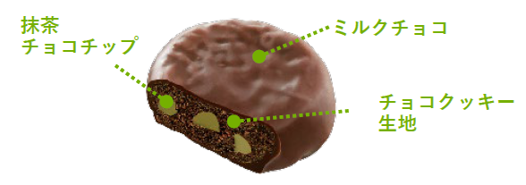 ・ココアを練り込んだしっとりチョコクッキー生地に抹茶チョコチップを組み合わせ、ミルクチョコレートでコーティング