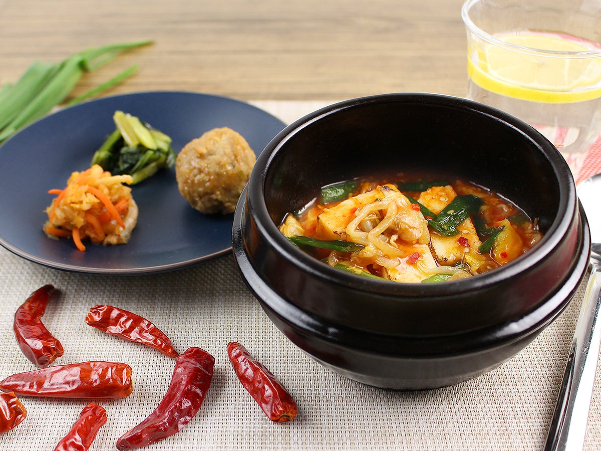コチュジャンの辛味と干し貝柱のコク豊かなスープが決め手のスンドゥブチゲです。具材には、焼き豆腐、アサリ、もやし、ニラ、卵を使用しております。海鮮の旨味と焼き豆腐のプルプル食感をお楽しみください。