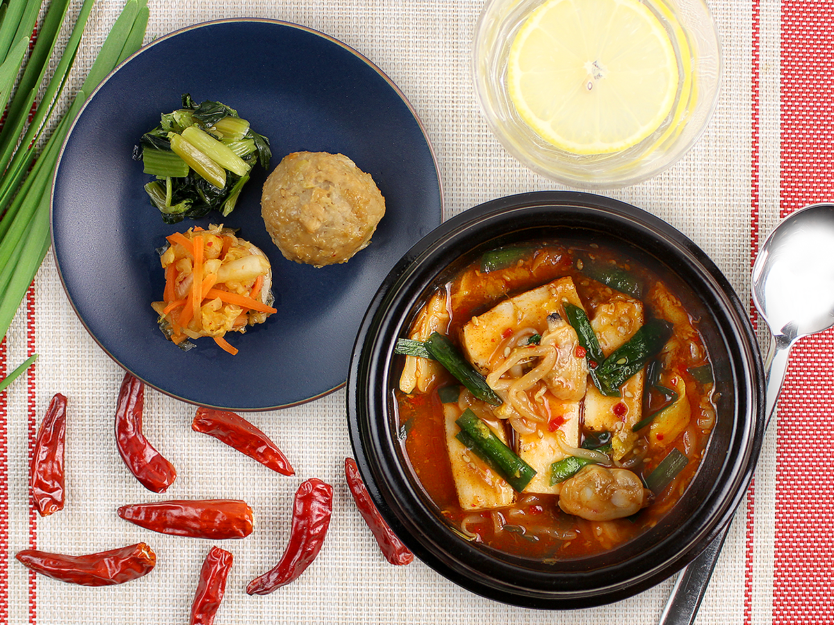 コチュジャンの辛味と干し貝柱のコク豊かなスープが決め手のスンドゥブチゲです。具材には、焼き豆腐、アサリ、もやし、ニラ、卵を使用しております。海鮮の旨味と焼き豆腐のプルプル食感をお楽しみください。
