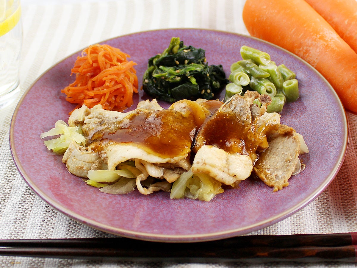 国産の豚ロースを使用し、柔らかくジューシーに焼き上げた豚の生姜焼きです。生姜が豊かに香る味付けとなっており、大人から子供までお楽しみいただけるメニューとなっております。副菜は、人参の青じそサラダ、ごま香るほうれん草のおひたし、インゲンのからしマヨです。