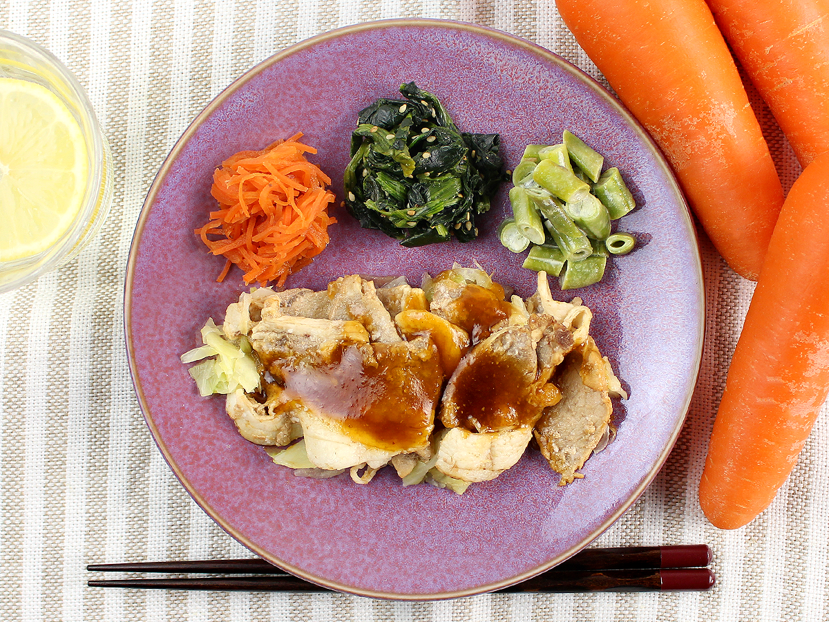 国産の豚ロースを使用し、柔らかくジューシーに焼き上げた豚の生姜焼きです。生姜が豊かに香る味付けとなっており、大人から子供までお楽しみいただけるメニューとなっております。副菜は、人参の青じそサラダ、ごま香るほうれん草のおひたし、インゲンのからしマヨです。