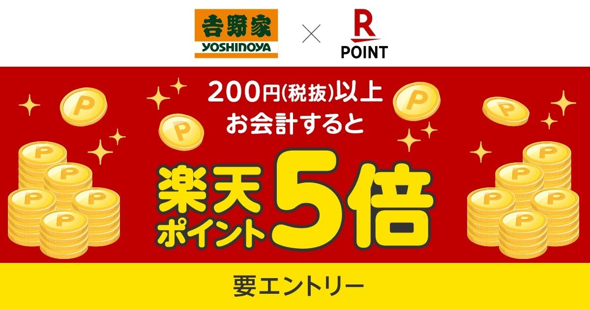 | 特典 | キャンペーン期間中にエントリーのうえ、「吉野家」で「楽天ポイントカード」を提示して200円(税抜)以上会計すると「楽天ポイント」を通常の5倍進呈します。 |