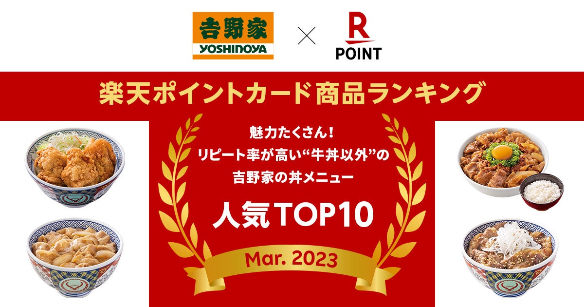 株式会社吉野家(以下「吉野家」)と楽天ペイメント株式会社(以下「楽天ペイメント」)は共同で、「楽天ポイントカード商品ランキング」において「魅力たくさん!リピート率が高い“牛丼以外”の吉野家の丼メニュー人気TOP10」を発表しました。