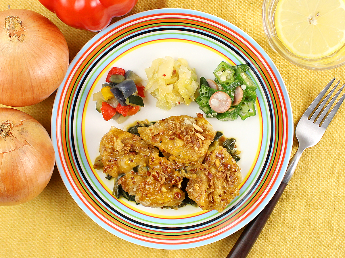 鶏もも肉のから揚げに、甘酸っぱくてマイルドなハニーマスタードソースを合わせました。添え野菜の菜の花は、ほろ苦さがソースとよく合いクセになります。仕上げに振りかけたフライドオニオンの香ばしい風味もお楽しみください。