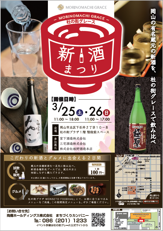 両備ホールディングス株式会社(本社:岡山県岡山市北区下石井2-10-12 杜の街グレース オフィススクエア5F、代表取締役社長:松田敏之)は、岡山市街地の中心に位置する杜の街グレース(所在地:岡山県岡山市北区下石井|https://www.morinomachi-grace.jp/)にて、「住む人、働く人、訪れる人」に楽しんでいただこうと、3月25日(土)・26日(日)の2日間、「杜の街グレース 新酒まつり」を開催しますのでお知らせいたします。