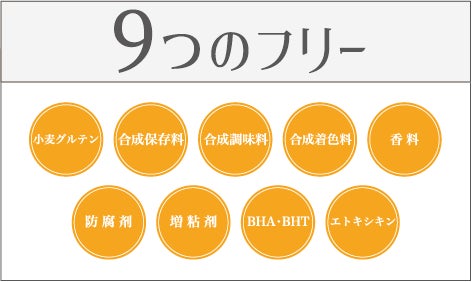 安心安全にこだわり、わんちゃんの体の負担を考えて、厳選した原材料のほか、添加物の使用についてもとことん考え抜き、添加物*は一切使用しておりません。さらに、一般的に嗜好性を高めるために施されているオイルコーティングを採用せず、「ノンオイルコーティング」となっています。カツオの香りと馬肉やマグロを配合することで、自然なおいしさにこだわり食いつきを良くしています。