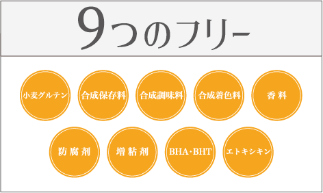 安心安全にこだわり、わんちゃんの体の負担を考えて、厳選した原材料のほか、添加物の使用についてもとことん考え抜き、添加物*は一切使用しておりません。さらに、一般的に嗜好性を高めるために施されているオイルコーティングを採用せず、「ノンオイルコーティング」となっています。カツオの香りと馬肉やマグロを配合することで、自然なおいしさにこだわり食いつきを良くしています。