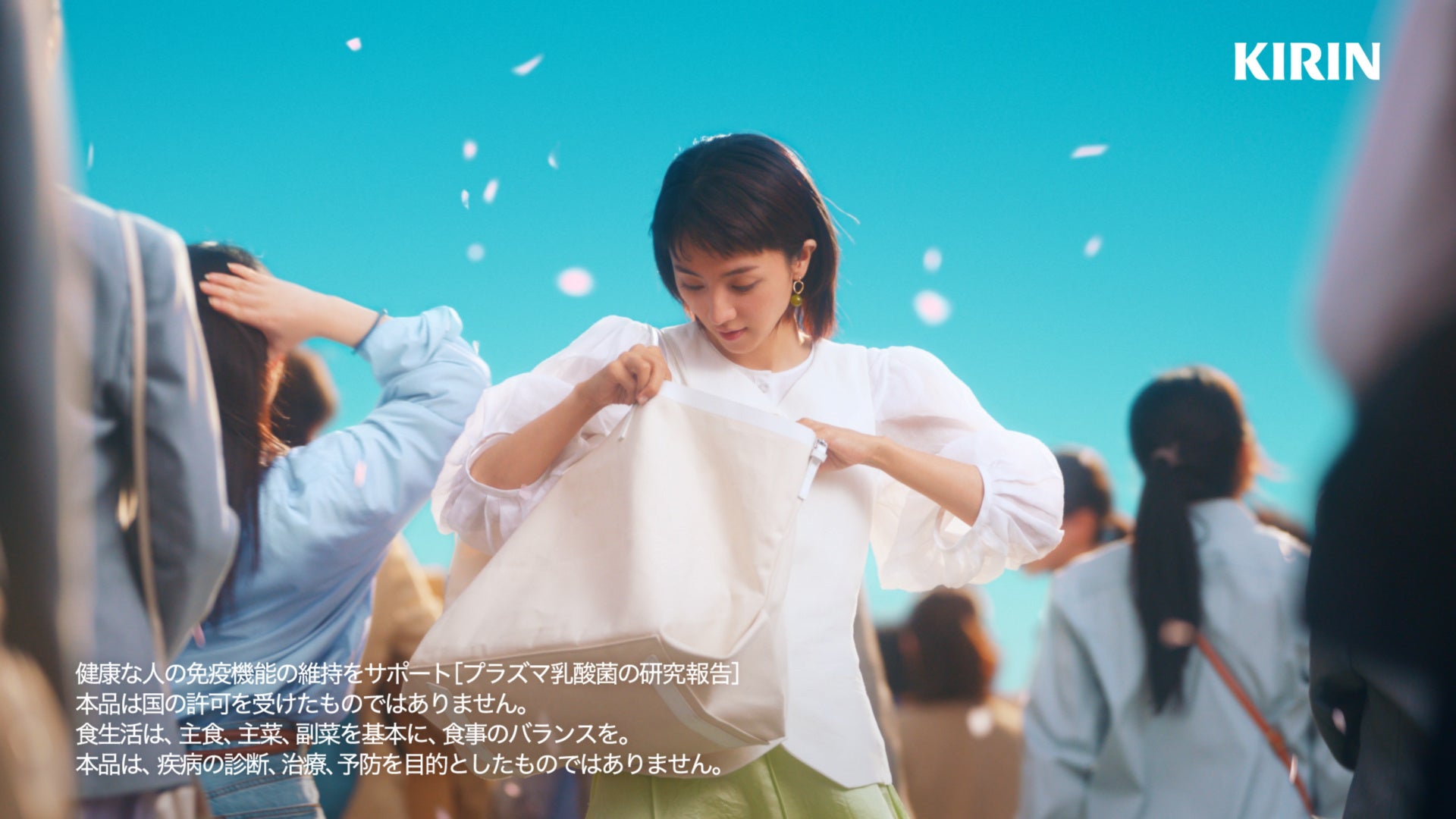 満島ひかりさんが、桜舞う人込みの中、季節の変わり目の体調管理のために『キリン 生茶 免疫ケア』をおいしそうに一口飲み、前向きな表情でさっそうと歩きだす姿が印象的なCMです。
