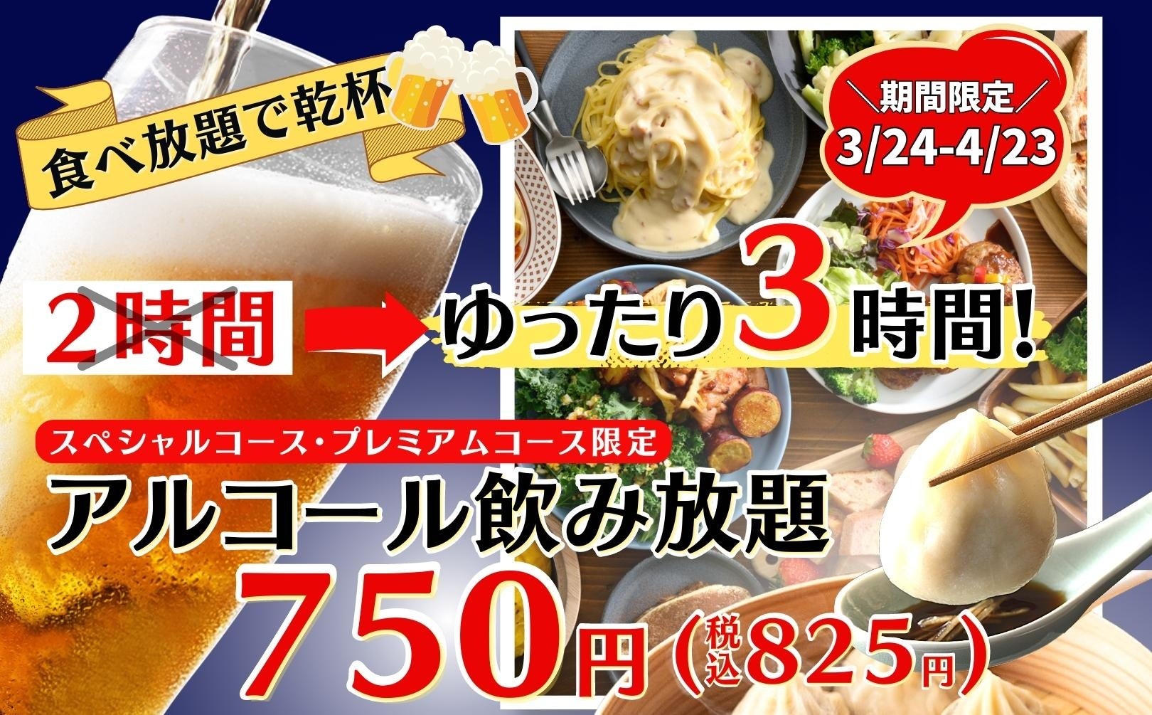そしてこの度、2023年3月24(金)~ 2023年4月23日(日)の期間中、スペシャルコース / プレミアムコース限定!2時間制の750円(税込825円)アルコール飲み放題プランが『1時間』無料拡大にて満喫できる『1時間拡大キャンペーン』を開催いたします!