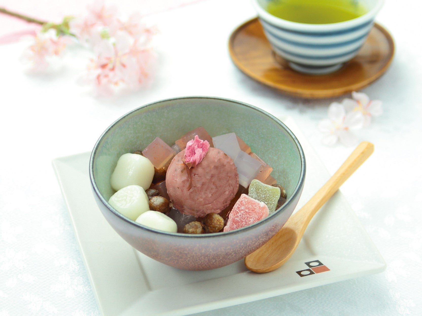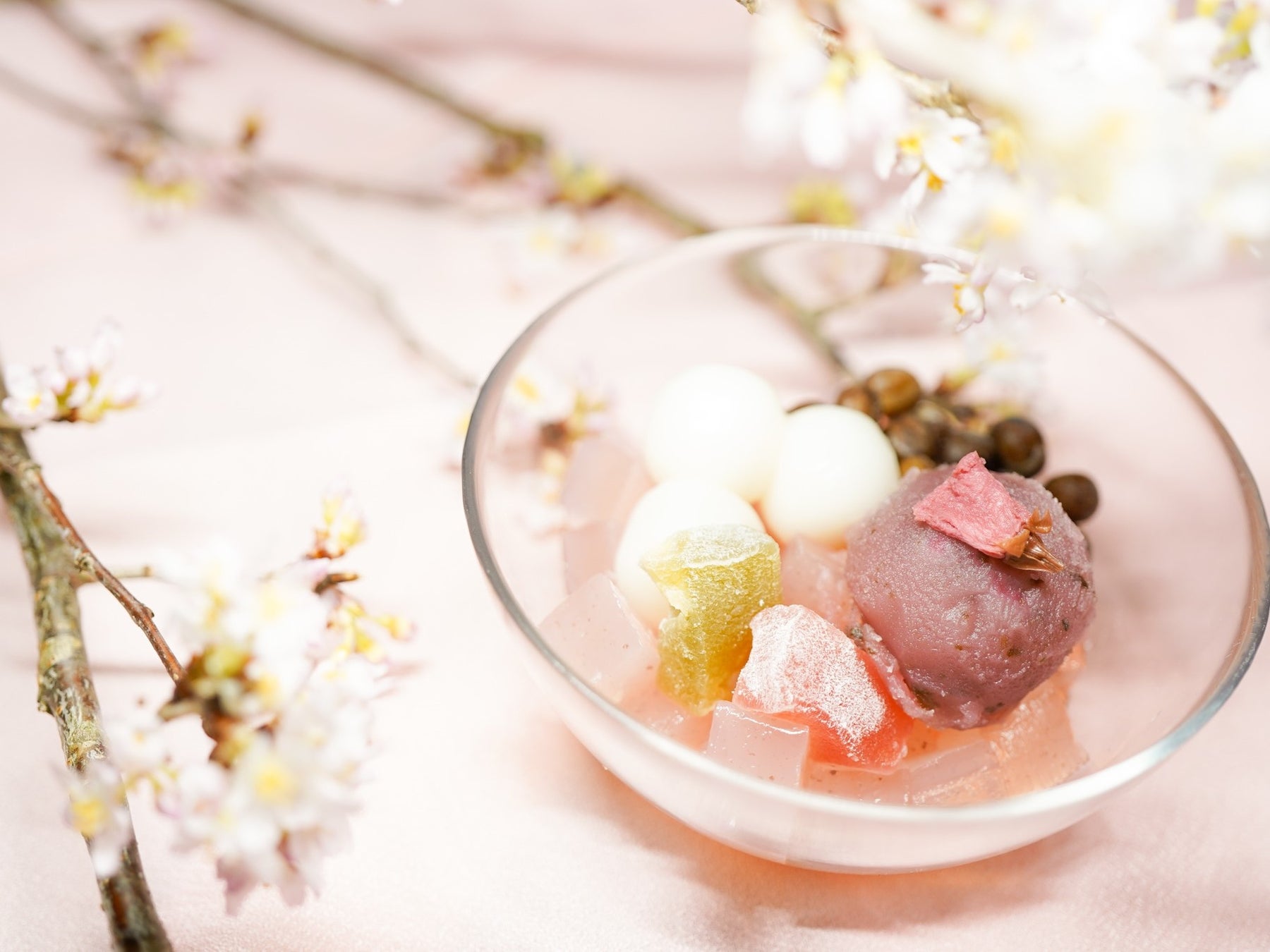 上品な桜づくしのあんみつは春に味わいたい一品です。