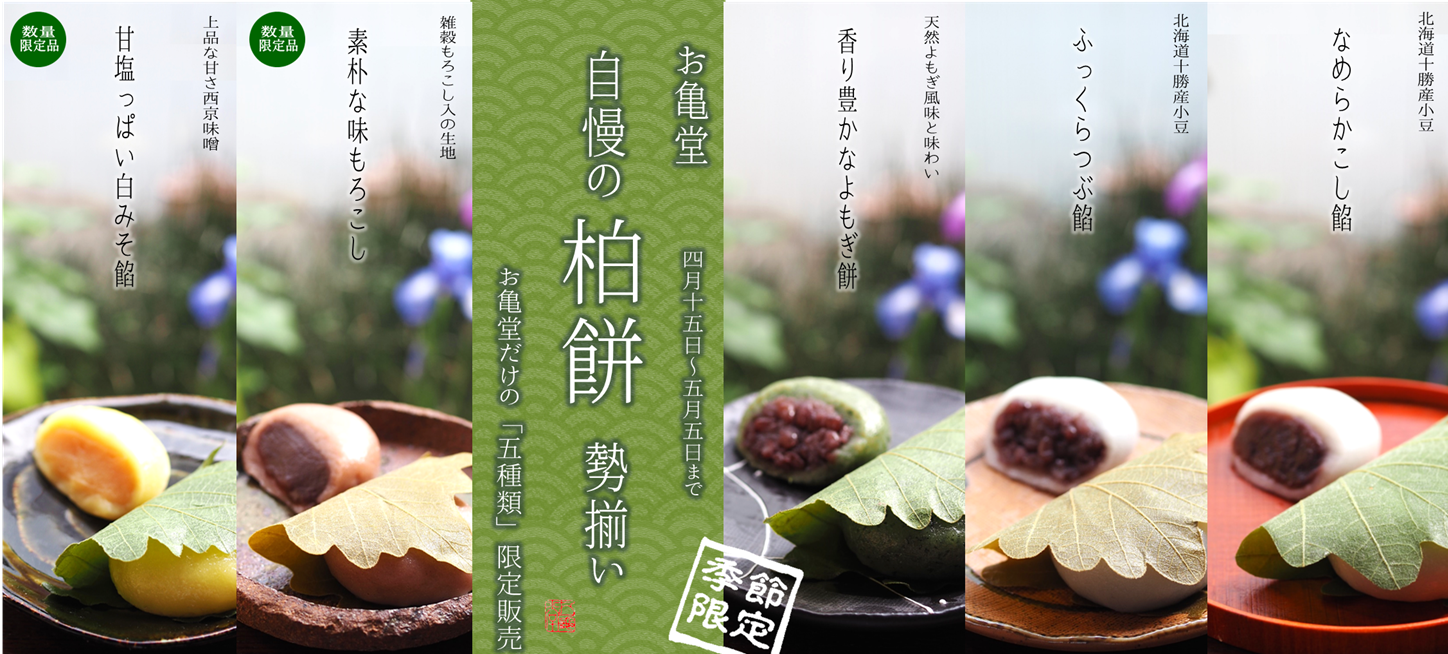 株式会社お亀堂(本社所在地:愛知県豊橋市 代表取締役:森貴比古)が展開する愛知県三河地域で70年以上の永きにわたりご愛顧頂いている老舗和菓子店「お亀堂」は、柏餅5種類を4月中旬からお亀堂直営店各店で販売いたします。