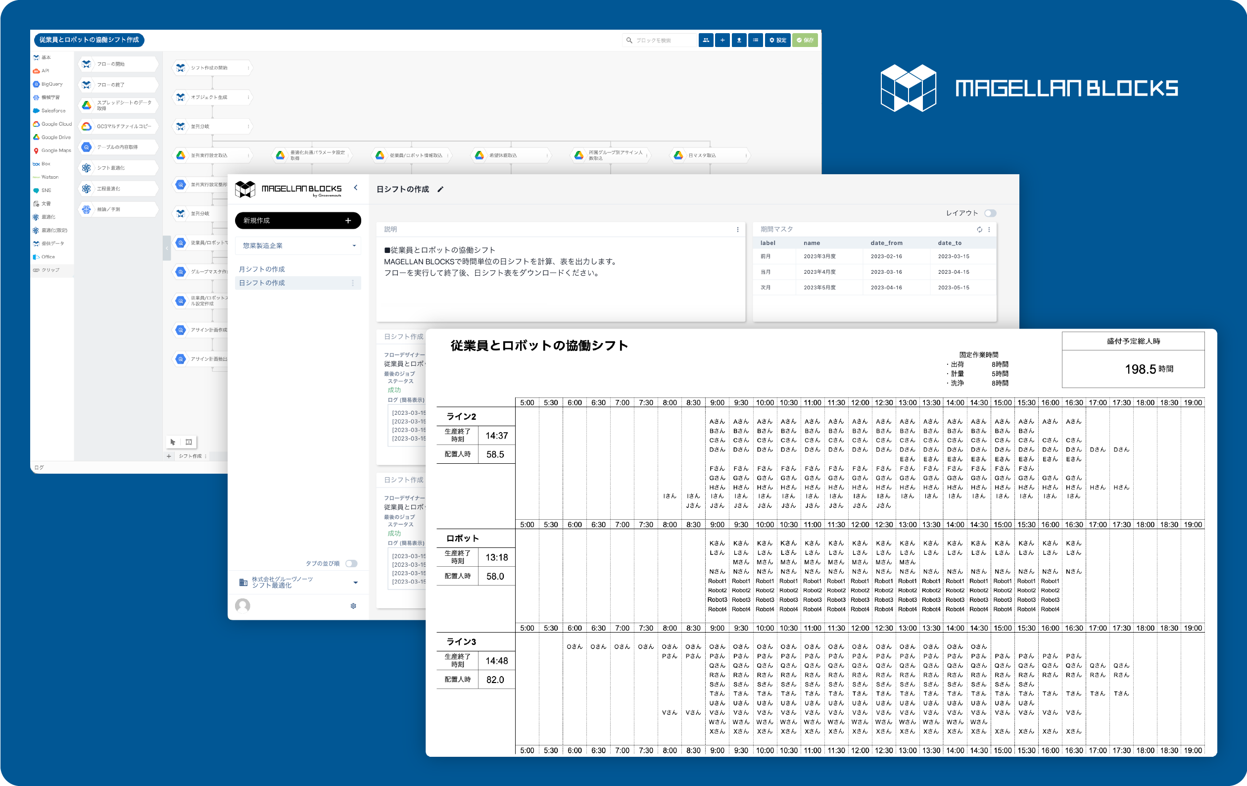 人とロボットが協働する工場の生産性を上げるには、人とロボットそれぞれのスキルや能力、役割等を考慮して作業計画を立てることが重要です。今年度の本事業においては、特にマックスバリュ東海株式会社と、従業員に加えてラインで稼働するロボットも対象に、量子コンピュータを活用した最適な勤務シフト作成に取り組みました。これらの仕組みには、豊富な機能で短期間のシステム構築を可能にするグルーヴノーツのクラウドプラットフォーム「MAGELLAN BLOCKS(マゼランブロックス)」を利用しています。