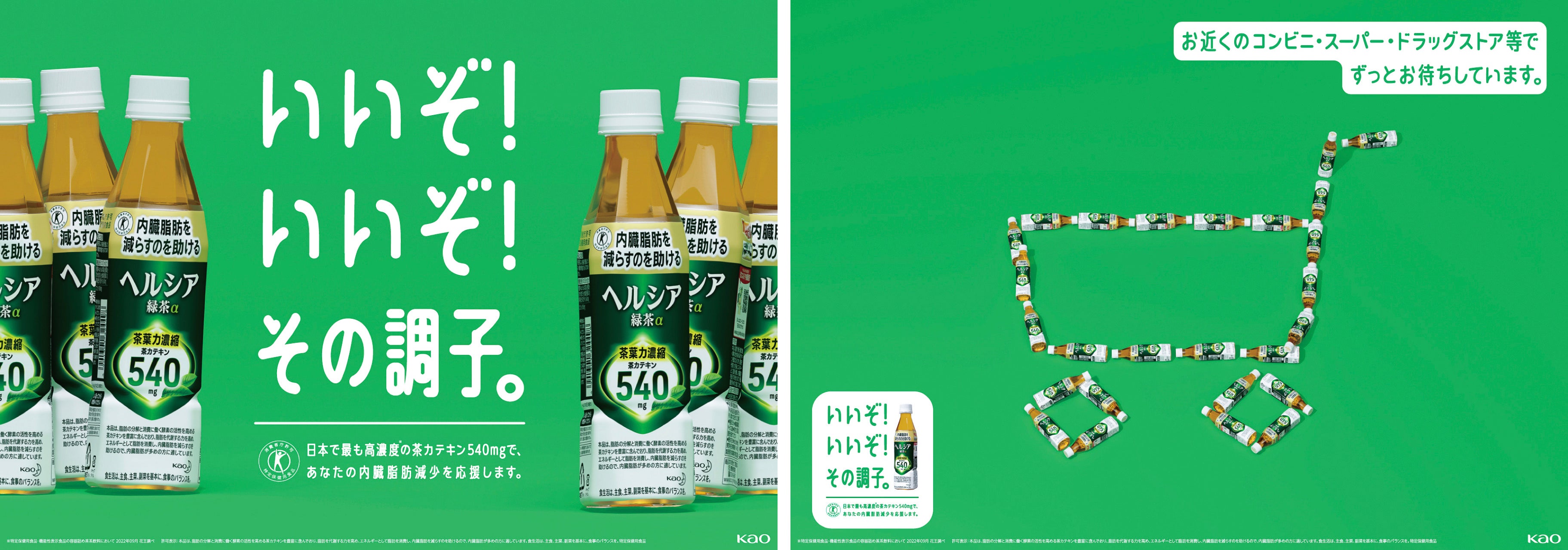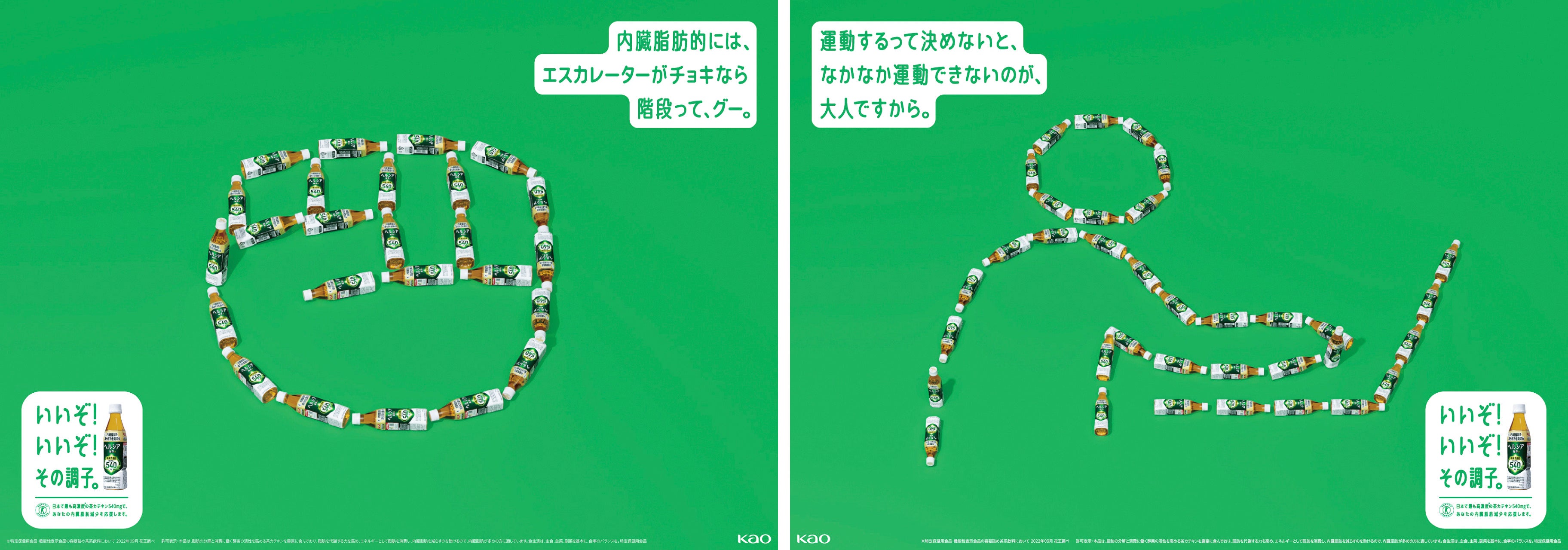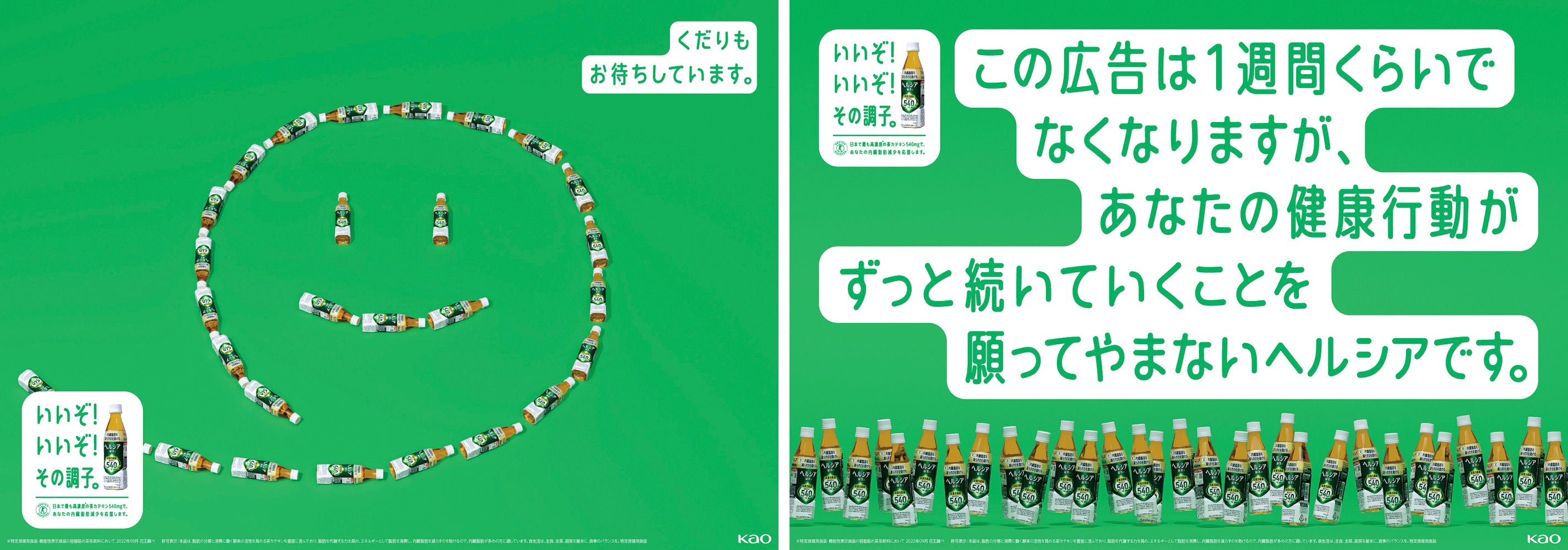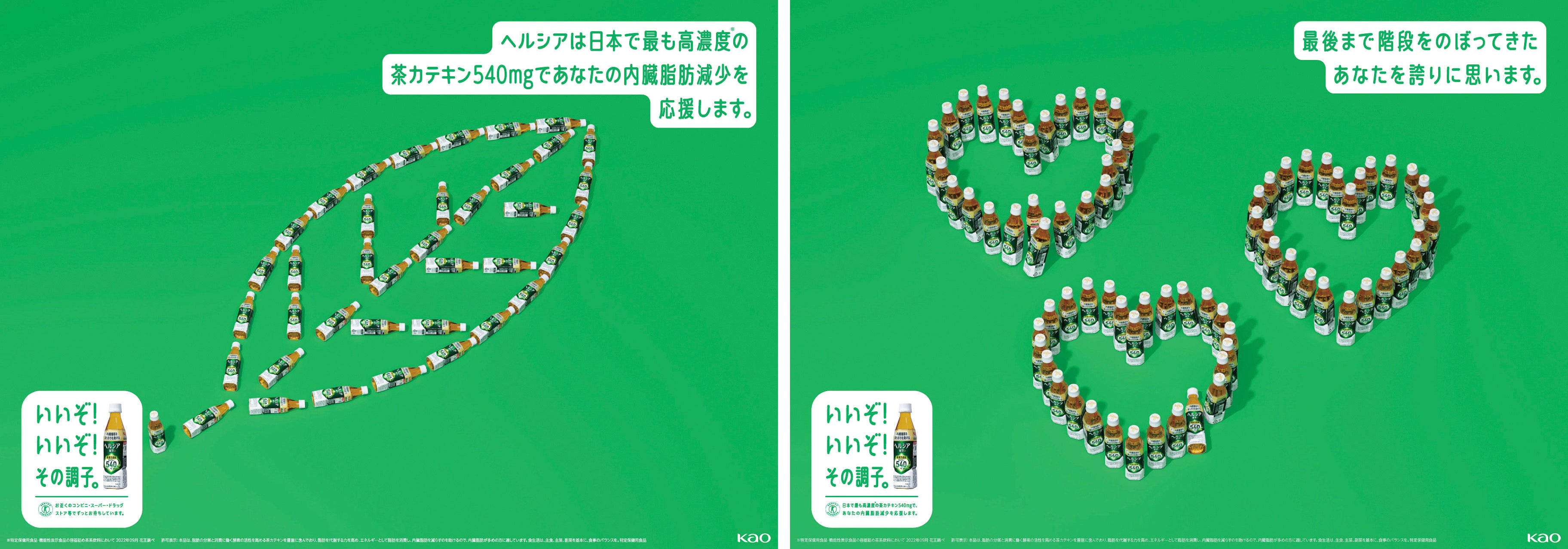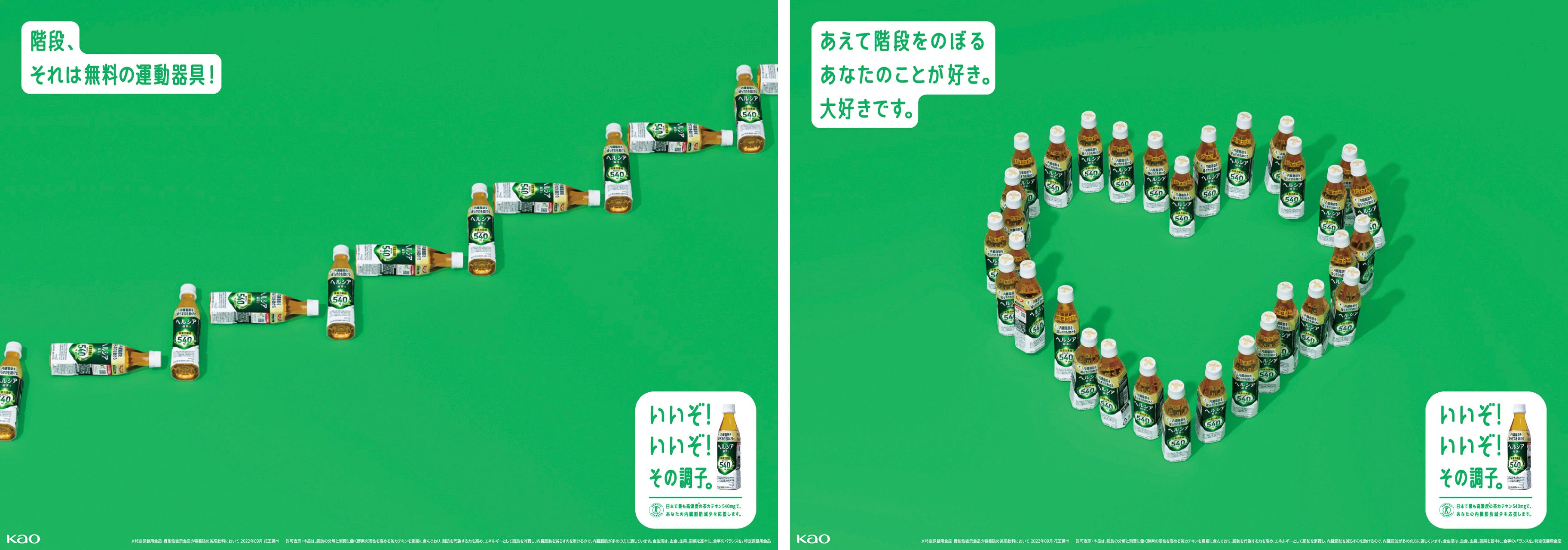 ヘルシア緑茶は、体脂肪減少を助けるお茶として2003年に発売されました。以来、名前の由来である“ヘルシーをアシストする”の通り、ブランド「ヘルシア」は内臓脂肪をはじめとした健康の悩みに寄り添い、多くの方をサポートしてきた実績を持ちます。そんなヘルシアが発売20周年を迎えるにあたり、より多くの方に日常生活の中でささやかな健康行動を継続する大切さを知っていただくべく、東京・都営大江戸線六本木駅の階段、大阪・阪急大阪梅田駅のムービングウォークに、サステナブル・エクササイズを楽しんでいただくための、様々な応援メッセージ広告を掲出します。