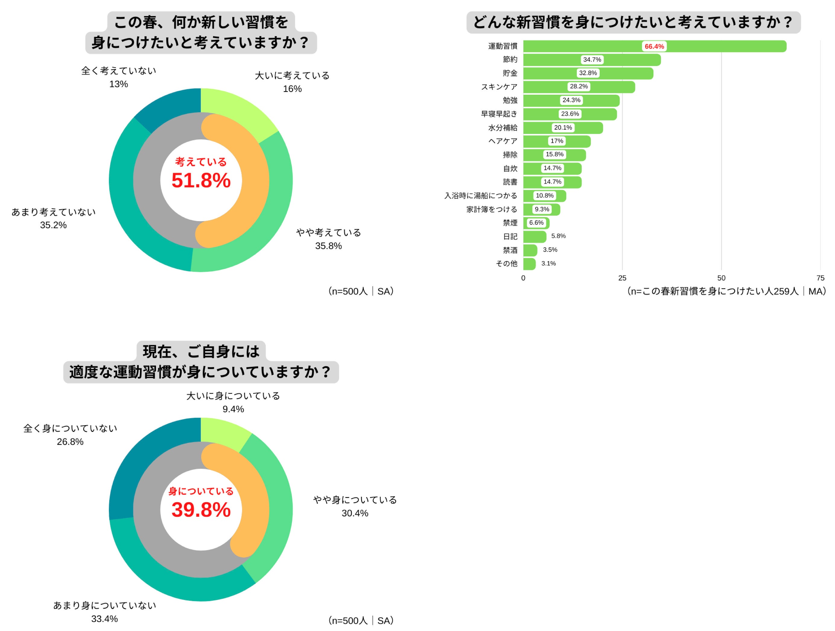 この春、新習慣を身につけたいと考えている人は半数以上の51.8%で、身につけたい習慣の圧倒的1位は「運動習慣」66.4%でした。一方で、実際に適度な運動習慣が身についている人は全体の39.8%にとどまりました。