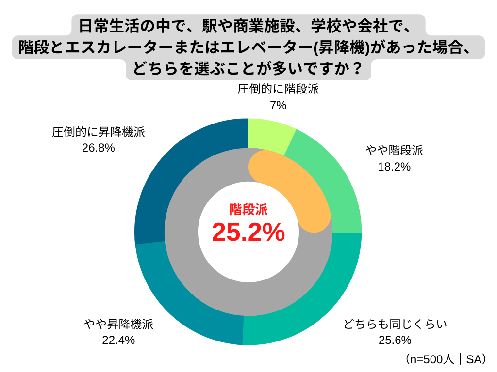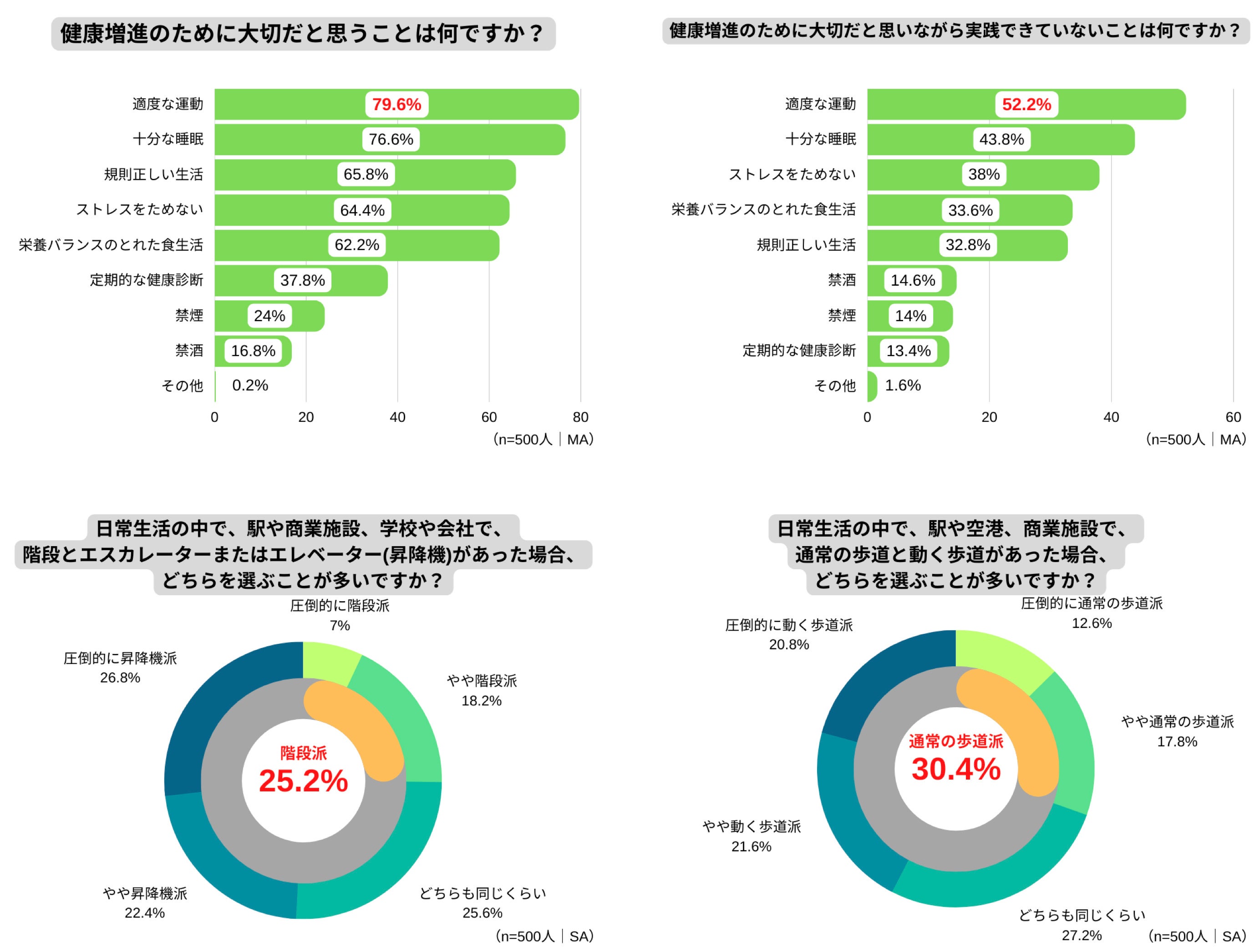 「健康増進のために大切だと思うこと」1位は「適度な運動」79.6%。同時に、「健康増進に大切だと思いながら実践できていないこと」の1位も「適度な運動」52.2%でした。 その中で、日常生活の中で階段と昇降機(エスカレーターやエレベーター)があった場合、主に階段を選ぶ人がおよそ4人に1人の25.2%いるなど、高い健康意識と運動への課題感を持つことで、「サステナブル・エクササイズ」を日々の生活に取り入れようとしている姿勢も垣間見える結果となっています。
