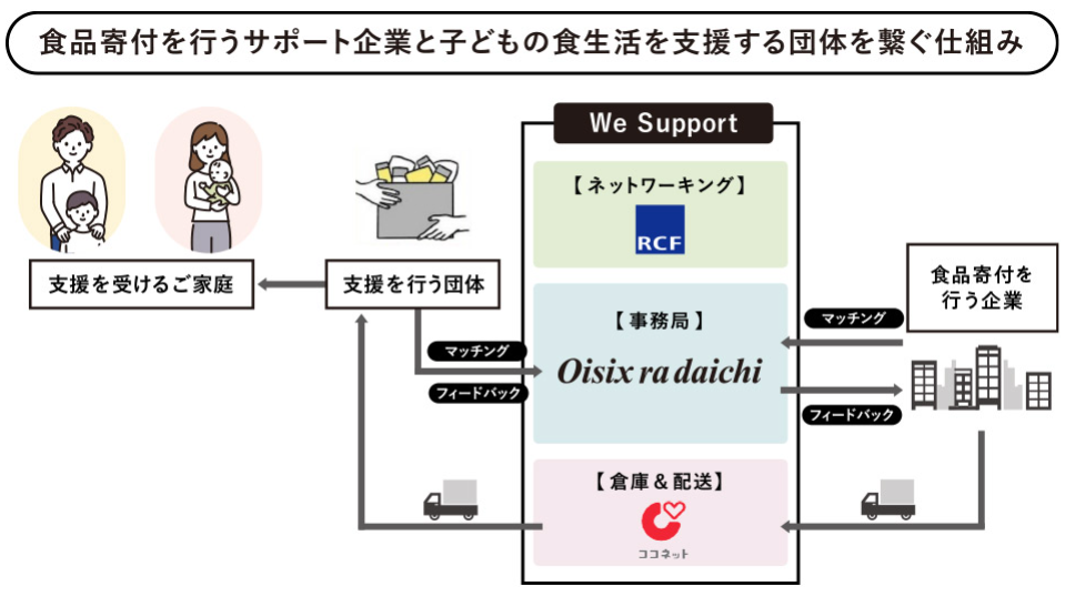 新型コロナウイルス患者の治療にあたる医療従事者に向け、食支援を行うため、一般社団法人RCF、オイシックス・ラ・大地株式会社、ココネット株式会社が連携し、2020年4月に「WeSupport」が設立されました。