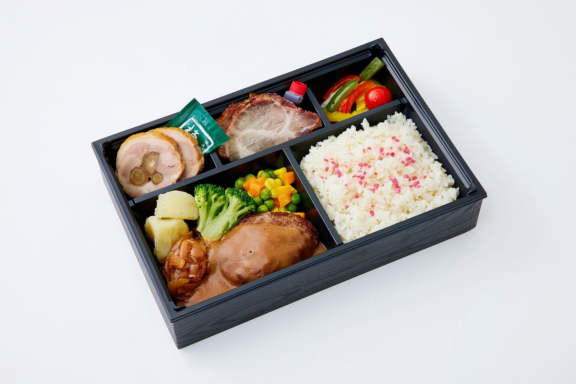 ○商品内容: [ハングリータイガー] ハンバーグ、[尾島商店]焼豚、[梅や]ごぼう巻、ライス、付け合わせ
