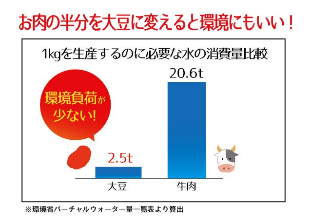 牛肉を1kg作るために必要なエサ(穀物)の量は11kgと、同じ量目なら牛肉より穀物そのものを食べる方がより多くの人のお腹を満たせます。また水不足が深刻化する地域が増える中、牛肉1kgで20.6tの水が必要なのに対し大豆1㎏では2.5tと少量で済みます。(※国際協力NGO World Visionより)たとえば、「肉を半分蒸し大豆にしたハンバーグ」では水の使用量は約60%に削減されます。温室効果ガス排出量(CO2換算)も同様に大豆生産の方が少なくすむことから温暖化防止につながるのです。