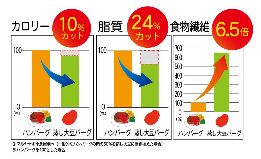 厚生労働省「日本人の食事摂取基準2020年版」では食物繊維の摂取目標量は、18歳~64歳では1日あたり男性21g以上、女性18g以上と定められていますが、「令和元年国民健康・栄養調査」によると、男女ともに目標値に足りていません。たとえば、「肉を半分蒸し大豆にしたハンバーグ」では、含まれる食物繊維量は約6.5倍になります。他にも蒸し大豆はたんぱく質が豊富、糖質が少ない点も魅力的。お肉に変わるたんぱく質の摂取源として、マルヤナギでは蒸し大豆をお肉料理に使うことをおすすめしています。