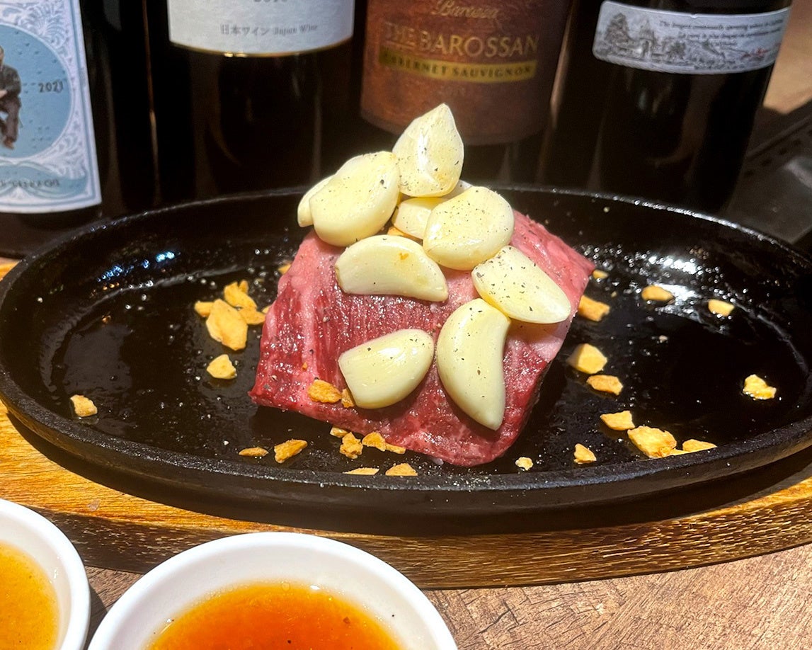 厚切りハラミを豪快に目の前で焼き上げる、テンションの上がるメニュー。焼いたスライスのにんにくと、USHIHACHI特製のにんにくダレを一緒に召し上がれ!
