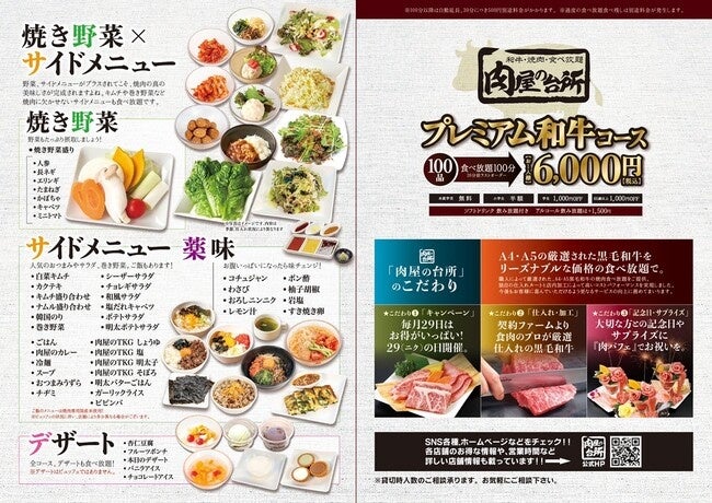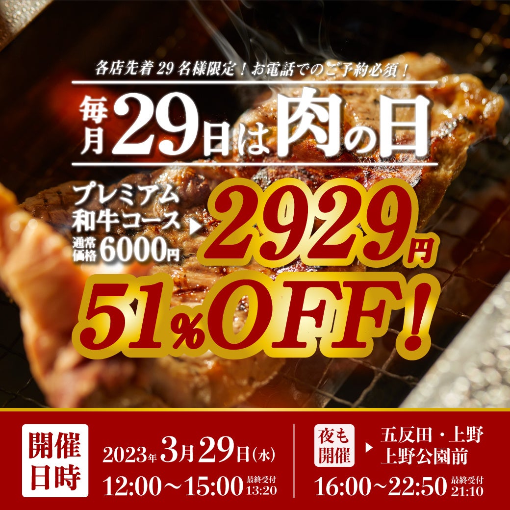 全100品以上⾷べ放題の「プレミアム和⽜コース」100min/6,000円(税込)&ソフトドリンク付き、⾁の⽇(3⽉29⽇)限定で、の2,929円(税込)にて提供いたします!