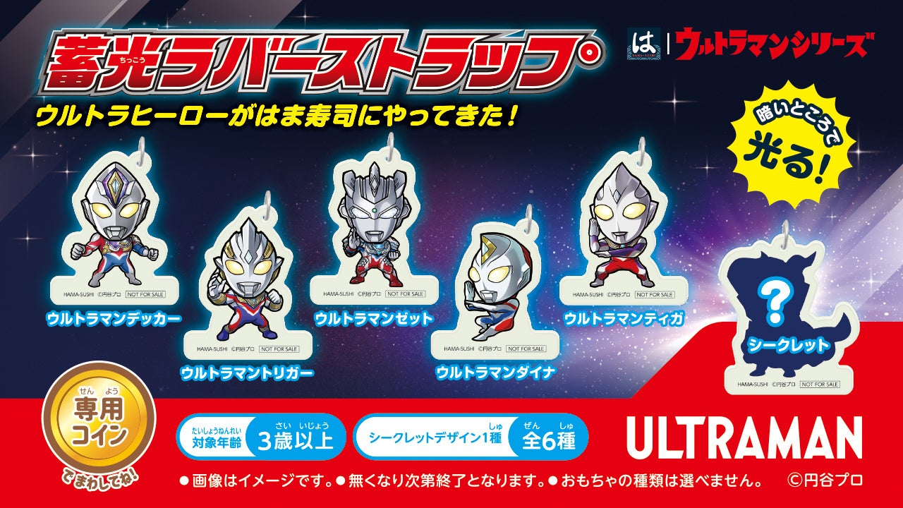 また、ウルトラマンシリーズが、暗いところで光る「蓄光(ちっこう)ラバーストラップ」としてはまっこセットに初登場します。最新ヒーローのウルトラマンデッカーをはじめとし、ウルトラマントリガー/ゼット/ダイナ/ティガといった歴代のウルトラヒーローたちが登場です。こちらもシークレットデザインを含む全6種類をご用意しています。