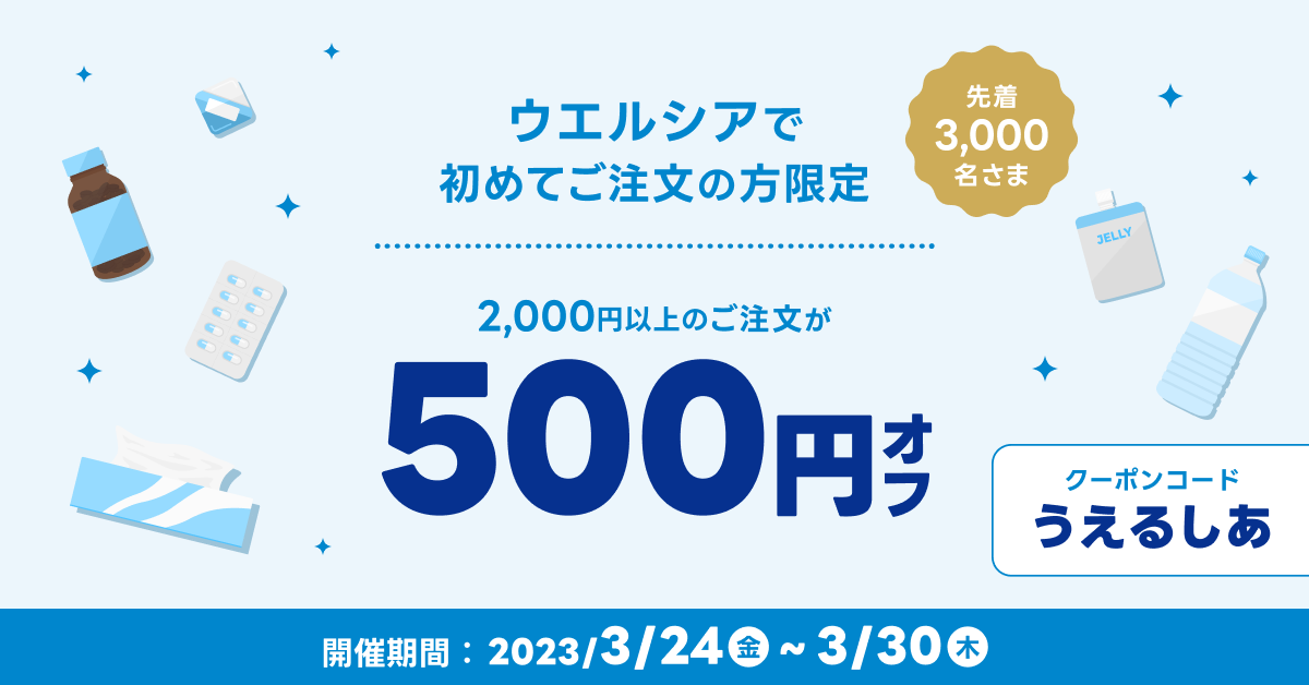 期間中、「出前館」から「ウエルシア」の商品を初めてご注文される先着3,000名さま限定!クーポンコード入力で2,000円以上の注文で500円オフのクーポンが利用可能となります。