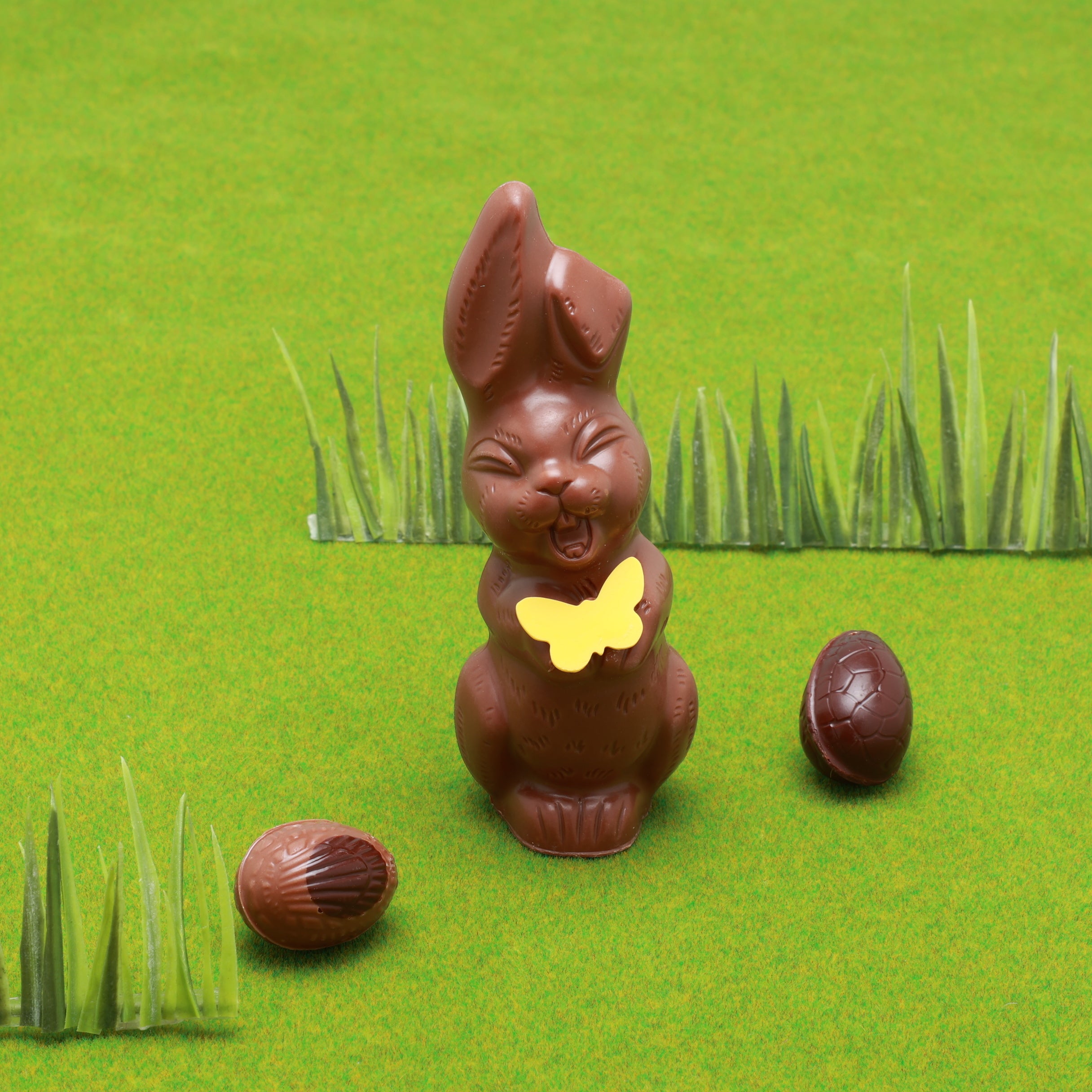 「シャス ア ルフ」とはフランス語でエッグハントのこと。イースターエッグを探す2匹の動物と、粒状ショコラ「ペルル クラッカントゥ ショコラ メランジュ」の詰合せ。