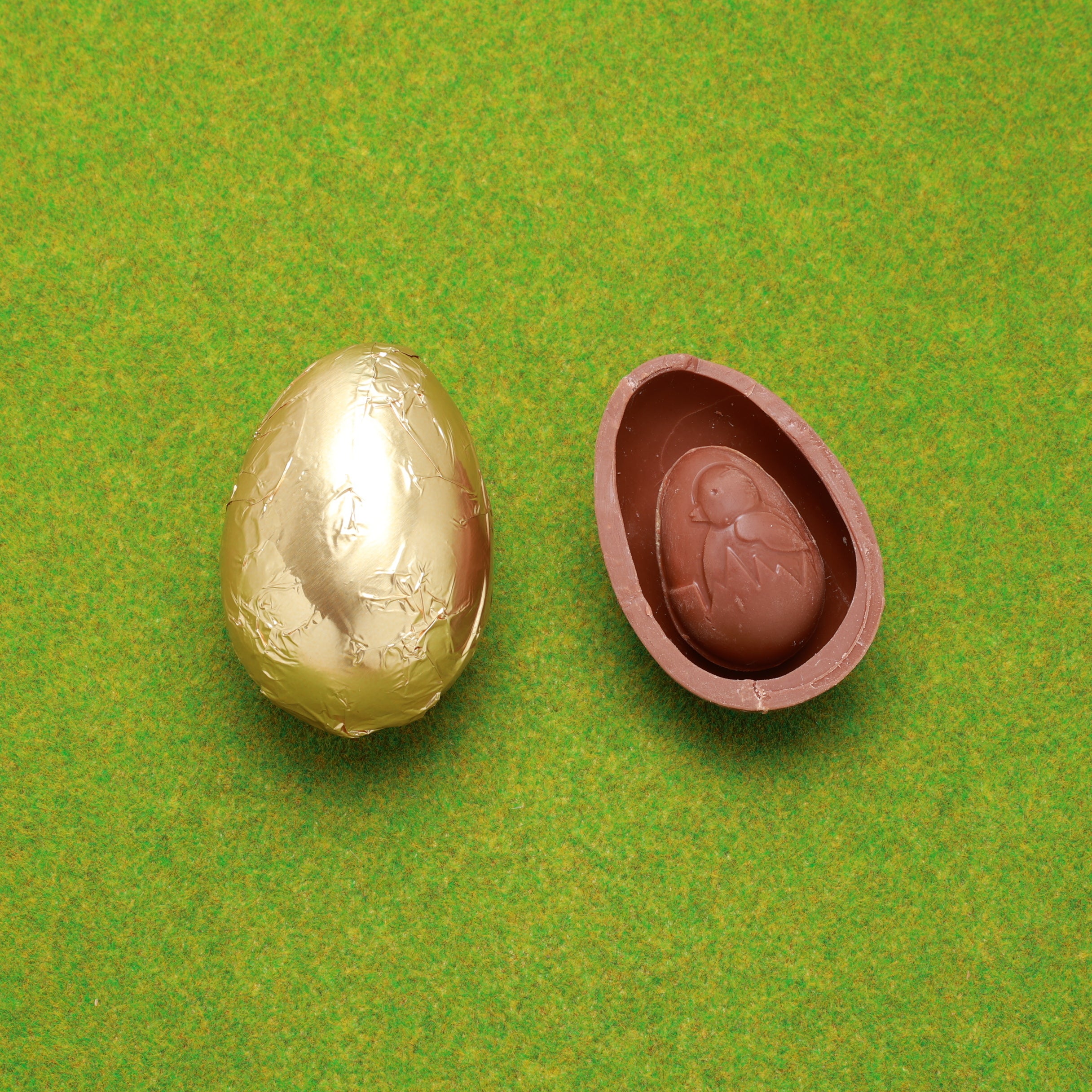 本物そっくりのミルクチョコレートの卵は、ひとつひとつ職人が手作りしています。中にはプラリネを詰めた卵型のボンボンショコラが1個入っています。